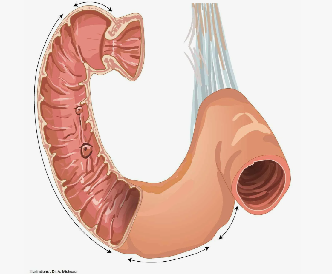 - «Duodenum mobile» — двенадцатиперстная кишка удлинённая и подвижная, может образовывать петли.