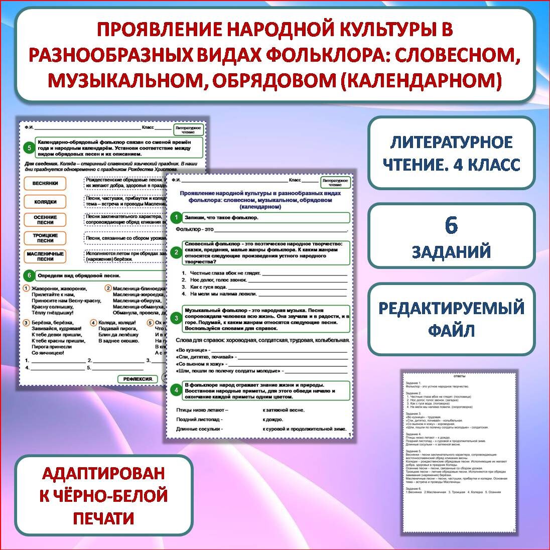 Рабочий лист «Проявление народной культуры в разнообразных видах фольклора: словесном, музыкальном, обрядовом (календарном)» разработан к уроку литературного чтения в 4 классе. Данная разработка может быть использована и в 5 классе на уроке со схожей тематикой. Состоит из 6 заданий (на двух листах). Имеются ответы к заданиям (на одном листе). Задание 1. Запиши, что такое фольклор. Задание 2. Словесный фольклор - это поэтическое народное творчество: сказки, предания, малые жанры фольклора. К каким жанрам относятся следующие произведения устного народного творчества? Задание 3. Музыкальный фольклор - это народная музыка. Песня сопровождала человека всю жизнь. Она звучала и в радости, и в горе. Подумай, к каким жанрам относятся следующие песни. Воспользуйся словами для справок. Задание 4. В фольклоре народ отражает знание жизни и природы. Восстанови народные приметы, для этого обведи начало и окончание каждой приметы одним цветом. Задание 5. Календарно-обрядовый фольклор связан со сменой