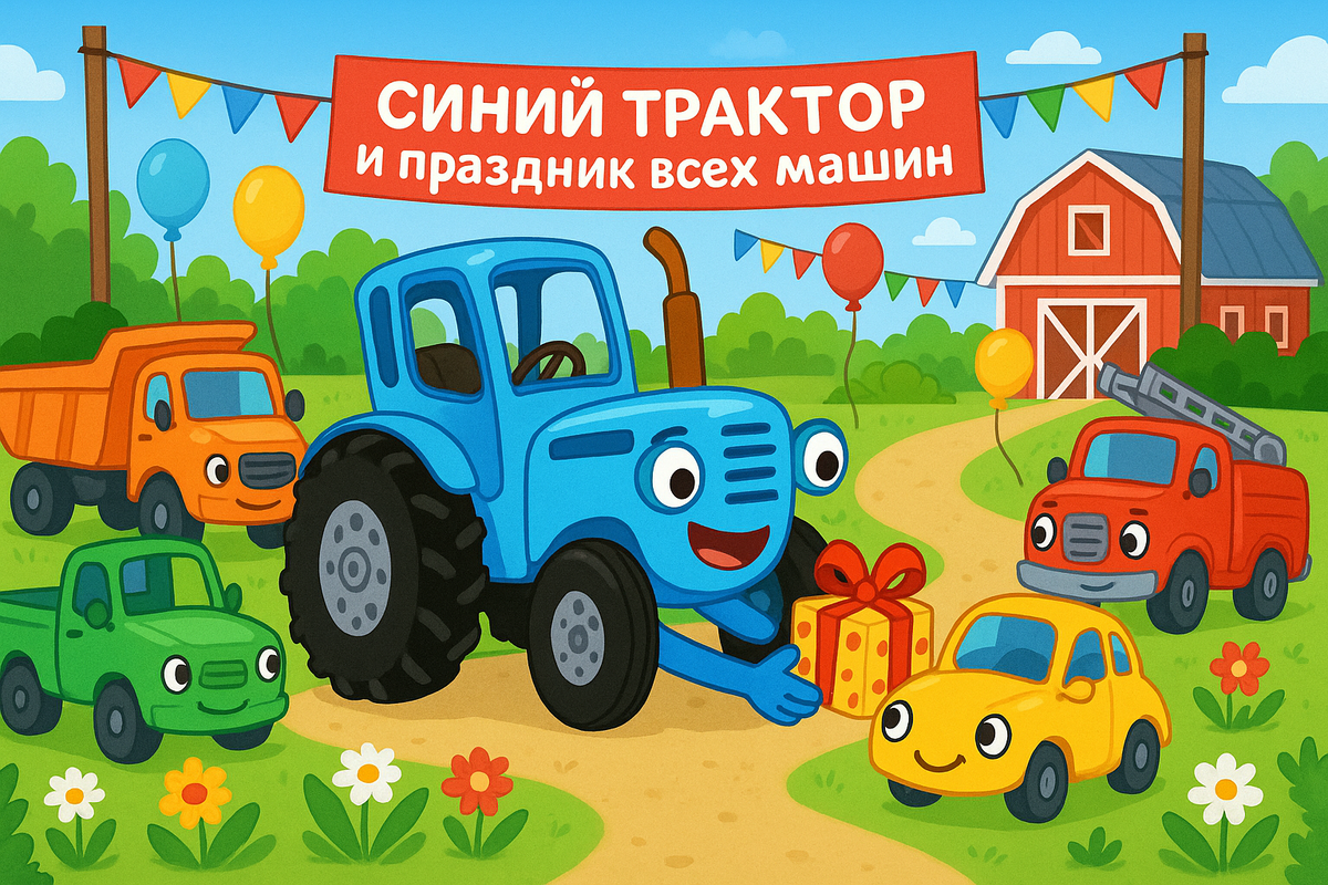 На зелёной ферме, где солнце каждый день встаёт под музыку петуха, а овощи танцуют под ветер, жил Синий Трактор. Он был самым добрым, весёлым и надёжным помощником на всей округе. Однажды утром, когда роса ещё не успела исчезнуть с травы, Трактор получил важную новость: скоро состоится праздник всех машин! — ПРАЗДНИК?! — подпрыгнул Трактор. — Ой, как здорово! Нужно подготовиться! Этот день случался только раз в году, и собирались на него все машины: комбайны, экскаваторы, самосвалы, даже старенький велосипед-ветеран по имени Педалька. Глава 1. Подготовка к празднику На ферме началась суета. Все машины прибирались, натирали детали до блеска, придумывали поздравления. Но главное — дарили друг другу подарки! Синий Трактор решил подарить каждому другу что-то особенное. Он мастерил своими руками — кому колпачок от пыли, кому музыкальный гудок, а кому — бампер с блёстками. Праздник должен был начаться в полдень у большого амбара. Там поставили сцену, украсили гирляндами из фонарей и разноцве