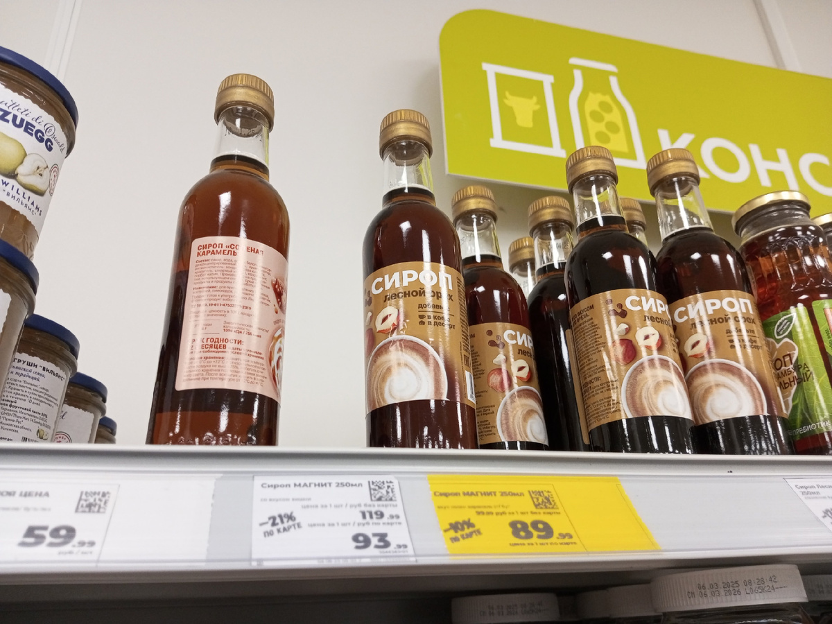 Начну с того, что стало самом первым в списке постоянных покупок. Аж нотка ностальгии появилась, т.к. пока что ограничиваю количество сахара и стараюсь не покупать подобные продукты, заказываю альтернативу на маркетплейсах, но так и хочется купить один из сиропов в "Магните". Они почти всегда продаются по акции, но выбор не такой большой, из того, что я покупала: кленовый, ореховый, вишневый, малиновый. Давненько находила шоколадный и с соленой карамелью, но уже сто лет в обед не попадаются ни в одном магазине сети.