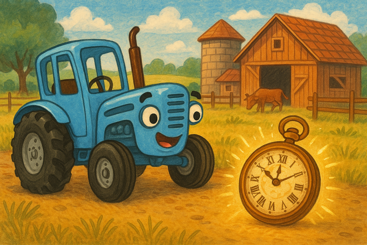 На весёлой зелёной ферме, где каждое утро начинается с пения петуха и запаха свежего сена, жил Синий Трактор. Он был самым любознательным и весёлым трактором в округе. Каждый день он помогал на ферме: возил овощи, поливал грядки, играл с детьми и пел свои весёлые песни. Однажды, убирая старый сарай, Синий Трактор случайно наткнулся на странный предмет. Это были старинные часы с медным корпусом и стрелками, которые не двигались. На циферблате были нарисованы не только цифры, но и... загадочные символы: солнце, звёзды, луна и даже молния! — Что это за часы? — удивился Трактор. — Почему они спрятаны под соломой? Он тронул стрелку… и вдруг часы засветились золотым светом, а воздух вокруг начал мерцать. — Ой-ой! Что происходит?! — испугался Трактор. И тут… всё исчезло. Глава 1. В прошлом Когда Синий Трактор открыл фары, он увидел, что ферма стала какой-то… другой. Вокруг не было его друзей, сарай был новеньким, деревья — маленькими, а в огороде росли другие овощи. — Где я? — прошептал он. И