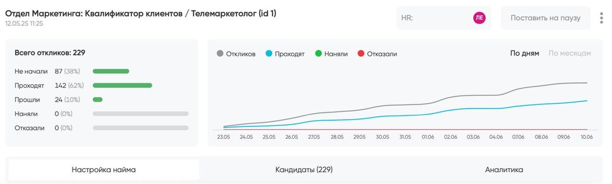 Как нанимать сотрудников без трудозатрат На выходных пишет старый друг, делится сложностью с наймом менеджеров себе на производство металлообрабатывающее. Несколько лет назад все было хорошо, а сейчас найм буксует и с лидами неважно. Продукт производит классный, надо продажи подтягивать. Делюсь как подбираем в крупный промышленный проект телемаркетологов для активации спроса и систему аналогичную можно транслировать на менеджеров. Один раз систему обучил, а потом она каждый новый найм делает сама Вот пример, за 2 недели 200+ откликов, из них 10% полностью прошли демонстрацию должности, познакомились с описанием продукта, компанией, мотивацией и сказали, что хотят у нас работать! Плюс подтвердили намерение вычиткой скрипта Из этих кандидатов отобрали больше половины и пригласили на стажировку для более глубокого погружения в продукт, на прослушку аудио и отсмотр резюме ушло около часа. А можно смотреть уже после стажировки Тех, кто справится со стажировкой пригласим в СРМ и провери