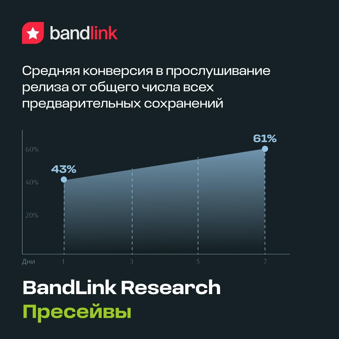 Продолжаем изучать музыкальную индустрию, определяя и раскрывая факторы, которые способствуют росту популярности и доходов артистов. В новом исследовании, проведённом совместно с командами Яндекс Музыки и VK Музыки, разбираемся в эффективности пресейвов для артистов разных уровней — от новичков до звёзд с большой аудиторией. Несколько интересных фактов: • артисты в 7 раз чаще стали использовать пресейвы в продвижении релизов • за прошедший год пресейвы в Яндекс Музыке, VK Музыке, Spotify и Apple Music, созданные через BandLink, а также через блок «Будущие релизы» в Яндекс Музыке сделали более 1,5 миллиона пользователей • фаны, сохраняющие релизы заранее, высоко вовлечены в прослушивание — 61% таких фанов слушает их в первую неделю после выхода, а 43% — в первый же день • пресейвы в 3 раза повышают шансы артистов с аудиторией до 100 тысяч ежемесячных слушателей на попадание релиза в Мою волну • в 2024 году доля пресейвов на стримингах распределилась следующим образом: 66,4% — Яндекс Муз