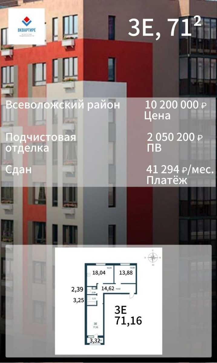 Кейс 🔑 3Е квартира 📍Всеволожский р-н, ЛО Ⓜ️Ладожская, 15 минут транспортом Семейная и IT-ипотеки в сданном доме 1 очереди со ставкой 4.5% на весь срок без удорожания Расчет по ипотеке: Отделка white box • цена — 10 200 000 ₽ • ПВ 20.1% — 2 050 200 ₽ • платеж — 41 294 ₽/мес. С ремонтом под ключ • цена — 11 572 140 ₽ • ПВ 20.1% — 2 326 001 ₽ • платеж — 46 849 ₽/мес. 👍Преимущества комплекса: - Тихий район с хорошей транспортной доступностью. - Развитая внутренняя и внешняя инфраструктура. - Качественная застройка, разнообразие планировок квартир. - Экологически чистая среда обитания. - Удобства для семей с детьми и автомобилистов. - Коммерческие возможности на первых этажах. ❗️Первая очередь проекта состоит из 6 кирпично-монолитных домов (9–12 этажей), отделанных цветной штукатуркой. Квартиры предлагаются классической и европланировки, с кухнями-гостиными, спальнями и гардеробными, сдача с предчистовой отделкой и потолками 2,72 м. Инфраструктура ЖК включает школу, детсады,