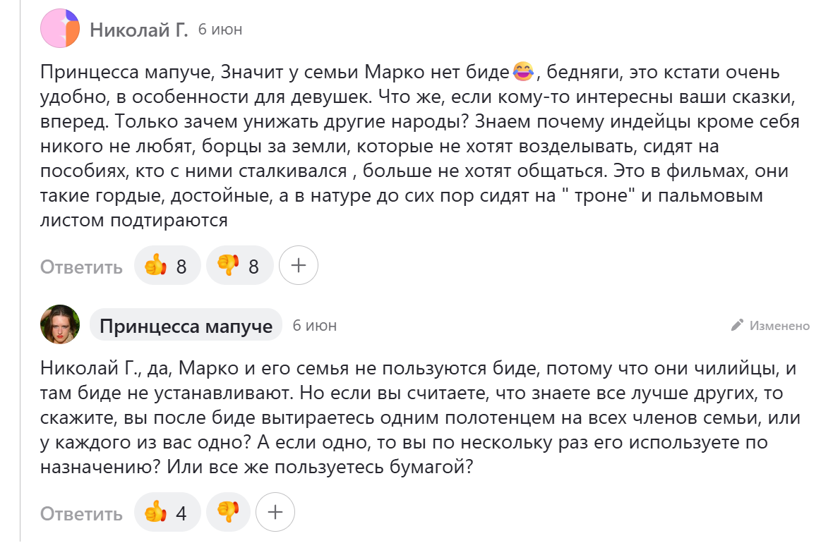 «Значит у семьи Марко нет биде😂, бедняги, это кстати очень удобно, в особенности для девушек. Что же, если кому-то интересны ваши сказки, вперед. Только зачем унижать другие народы? Знаем почему индейцы кроме себя никого не любят, борцы за земли, которые не хотят возделывать, сидят на пособиях, кто с ними сталкивался , больше не хотят общаться. Это в фильмах, они такие гордые, достойные, а в натуре до сих пор сидят на " троне" и пальмовым листом подтираются».
