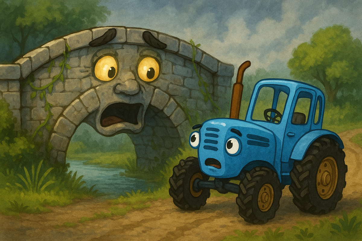 И весело вперёд ведёт!» Глава 1. Шёпот под колёсами Однажды вечером, когда солнце уже клонилось к закату, Трактор возвращался домой. Он въехал на мост… и вдруг услышал: — Псс… Трактор… помоги мне… Он резко остановился: — Кто здесь? — Это я… Мост… Я умею говорить. Просто давно никто не слушал. Синий Трактор удивился, но не испугался: — Ты говоришь? Зачем зовёшь? — Я чувствую, что скоро разрушусь. Кто-то прокрался ночью и вытянул мои волшебные гвозди. Без них я могу упасть… — Волшебные гвозди? Это не пр