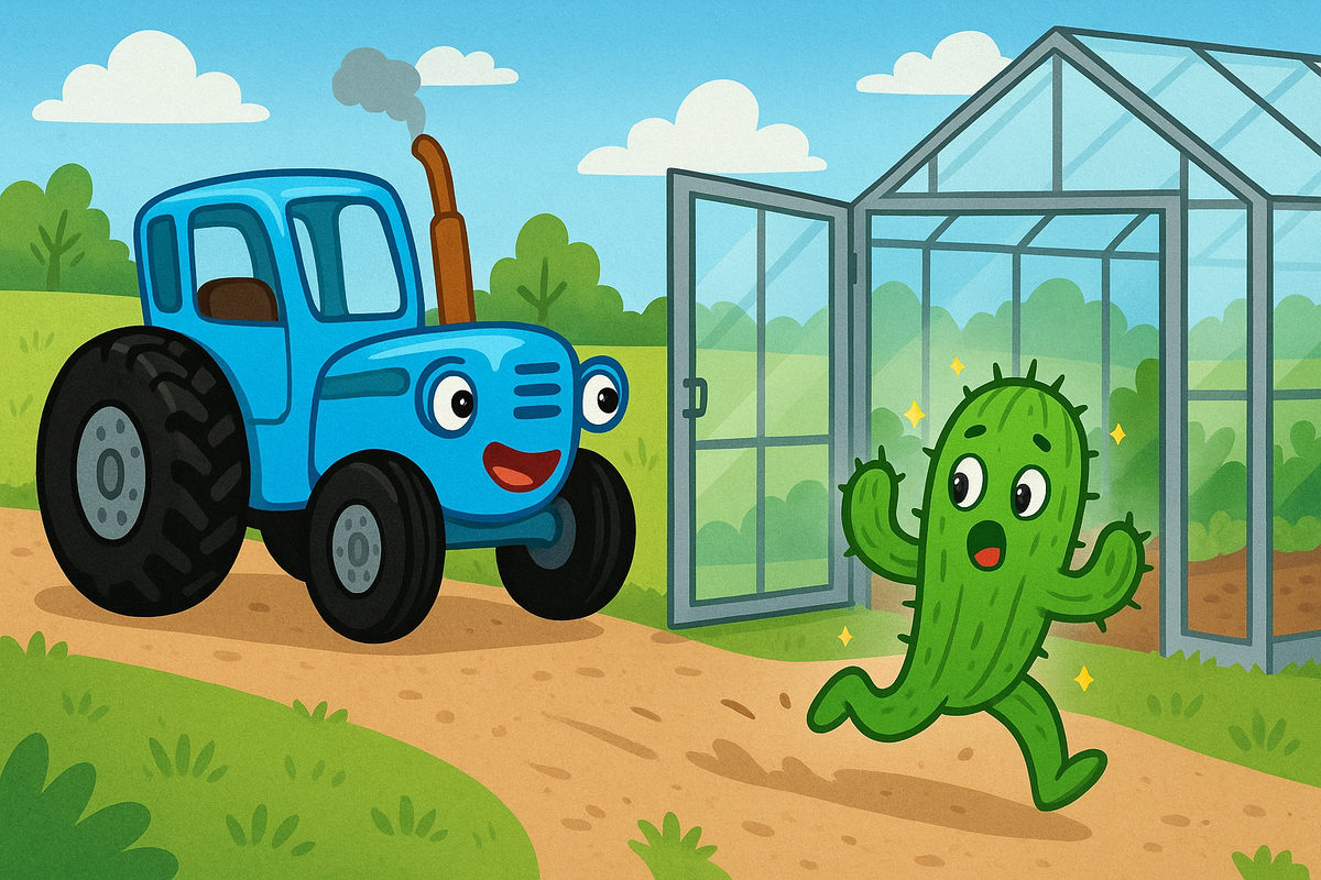 С друзьями по ферме я мчусь и жужжу!» Однажды утром Синий Трактор направился к теплице, чтобы поприветствовать свои растения. Он каждый день разговаривал с ними, потому что верил — у каждого росточка есть душа. Но как только он открыл дверь теплицы… Кактус убежал! Глава 1. Побег в кактусовых тапочках Кактус был кругленький, зелёный, с маленькими иголочками и красной шляпкой сверху. Он скачком выкатился из теплицы, подскочил, как мяч, и… побежал на коротеньких ножках! — Постой! — крикнул Трактор. — Куда это ты? Но кактус уже скрылся за поворотом. Петя-петух заметил беглеца первым: — Он пробежал мимо курятника! Прыгал и смеялся! Муня-Коровушка добавила: — Я думала, это детский мячик. Но у мячей нет глаз! — У него были глаза?! — удивился Трактор. — Это волшебс