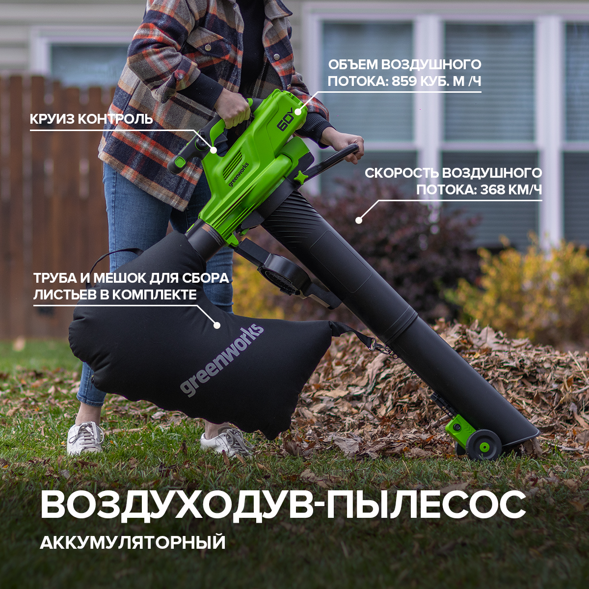 Познакомьтесь с новинкой от Greenworks — аккумуляторной воздуходувкой-пылесосом GD60BVII (2409307), 60V, мощным и компактным инструментом, который идеально подойдет для уборки придомовой территории и не только. 🔋 Инновационная мощь: воздуходувка оснащена бесщеточным двигателем DigiPro™, который гарантирует высокую производительность без необходимости в обслуживании и замене фильтров. 🌬️ Ураган в ваших руках: скорость воздушного потока до 368 км/ч позволяет легко справляться с влажной листвой, строительным мусором, мелкими камнями и даже снегом. 🌪️ Эффективность на высшем уровне: объем воздушного потока 859 м³/ч обеспечивает быструю и качественную уборку как в режиме воздуходувки, так и в режиме пылесоса. 🔄 Максимальная функциональность: инструмент легко превращается из воздуходувки в пылесос — в комплекте мешок для сбора листьев и труба, а колёсики поддерживают комфорт при длительной работе. 🪓 Измельчение для пользы: металлический нож на крыльчатке тщательно измельчает листья, уве