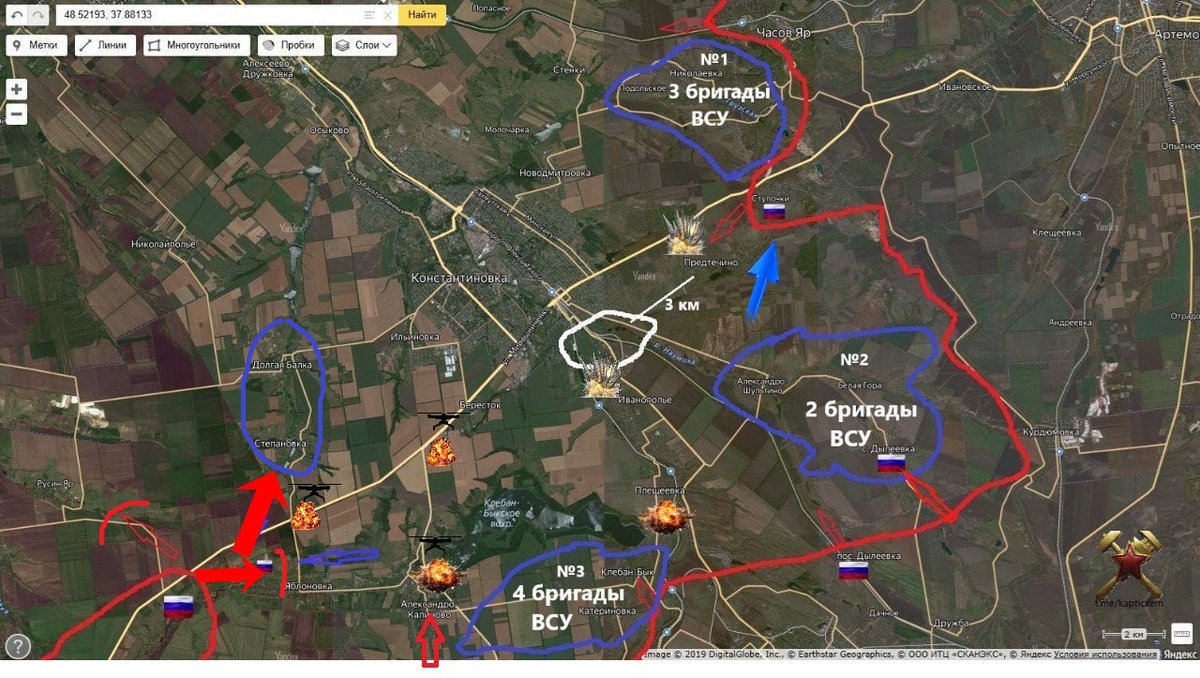 В ответ на пост Константиновское направление Противник предпринимает атакующие действия на южные окраины Ступочек из района группировки ВСУ №2 И в Яблоновке идут встречные бои. Враг пытается отодвинуть наши подразделения от центрального перекрестка рубежа 3.4, а оптимально и выбить из деревни Расчеты БпЛА "Рубикон" ВС РФ взяли под контроль дороги на Александро-Калиново и Яблоновку, У хохлов очень серьезные проблемы по логистике. Если им не повезет в этих атаках на центр Яблоновки, то через некоторое время, без подвоза, ротаций и эвакуаций, вся их оборона превратится в "тыкву". С нашей же стороны штурмовые группы забрали укрепления 3.3 и продвигаются к отсечному рубежу Степановка-Долгая балка (3.6), блокируя Русин Яр. схемы и карты
