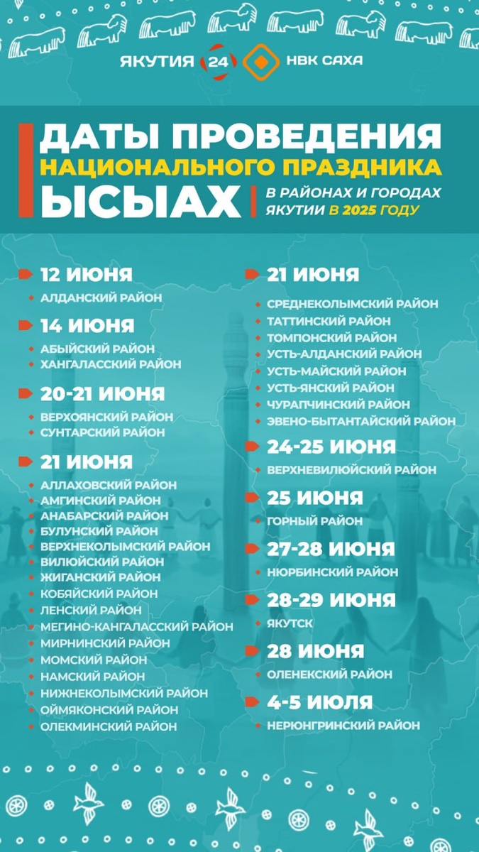 🌿☀️ Где и когда: Даты проведения главного национального праздника Ысыах в районах Якутии С 12 июня по всей Якутии стартуют празднования национального праздника Ысыах. Информационный портал «Якутия 24» составил список районов республики и дат, когда будет проходить главный праздник лета. Не упустите возможность стать частью этого значимого праздника! 😍 @Якутия 24
