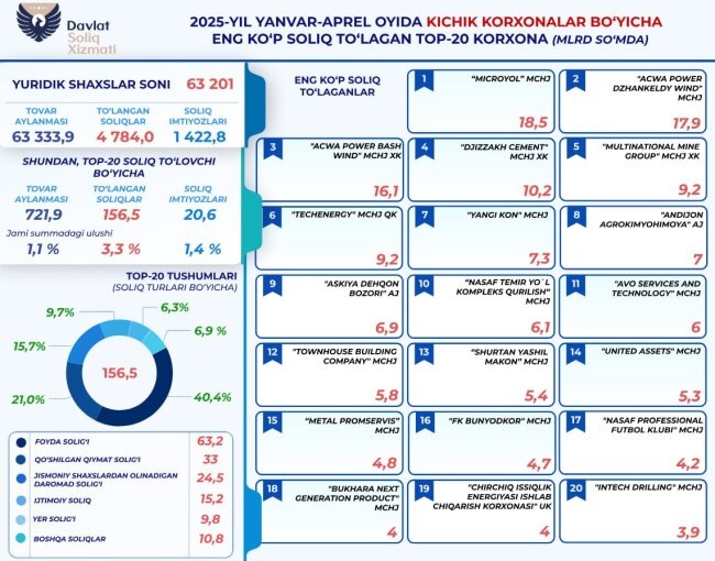 С января по апрель 2025 года в государственный бюджет Узбекистана 63 201 малое предприятие уплатило 4,7 триллионов сумов налогов. Их общий товарооборот составил 63 триллиона сумов, а общая сумма льгот составляет 1,4 триллион сумов. Отмечается, что 156,6 миллиардов сумов из них приходятся на 20 малых предприятий.