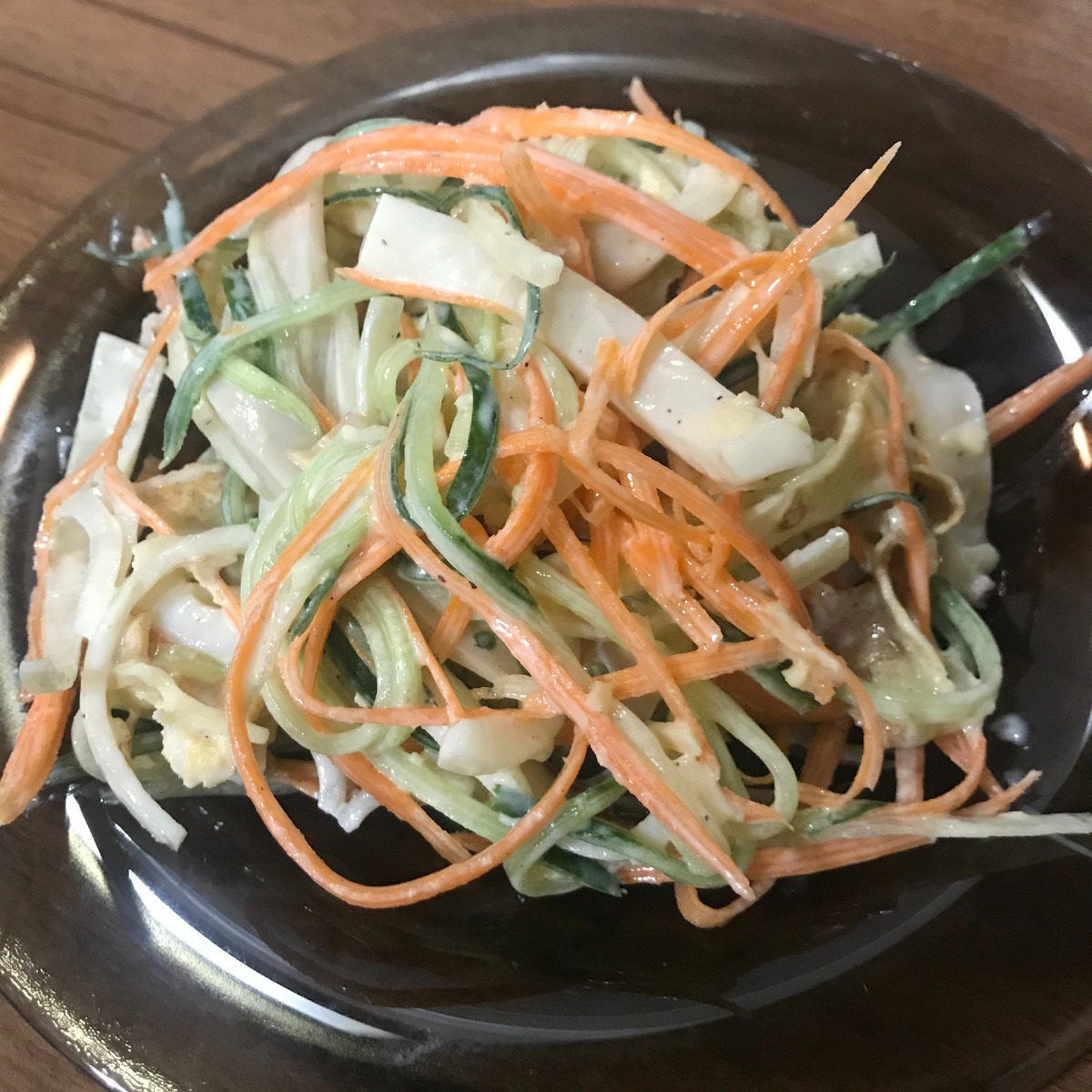 🔹Вода 100 мл 1️. Лук нарезать полукольцами, залить водой с уксусам и оставить мариноваться 2️. Яйца перемешать до однородной массы, но не взбивать. Поджарить на сковороде в виде блинчика. 3️. Кальмары разморозить заранее. Залить на 15 секунд кипятком, плёночка свернётся и легко удалиться. Варить в подсоленной воде с укропом, перцем и лавровым листом буквально 1 минуту. Вынуть и дать остыть. 4️. Яичный блинчик свернуть рулетики и нарезать. 5️. Морковь очистить и натереть на терке для морковке по-корейски или с помощью овощечистки со специальным ножом. 6️. Таким же образом нарезать/натереть огурец, серединку с семенами я не брала. 7️. Также трём сыр длинной соломкой. 8️. Кальмар разрезаем пополам и нарезаем соломкой. 9️. Все ингредиенты складываем в глуб