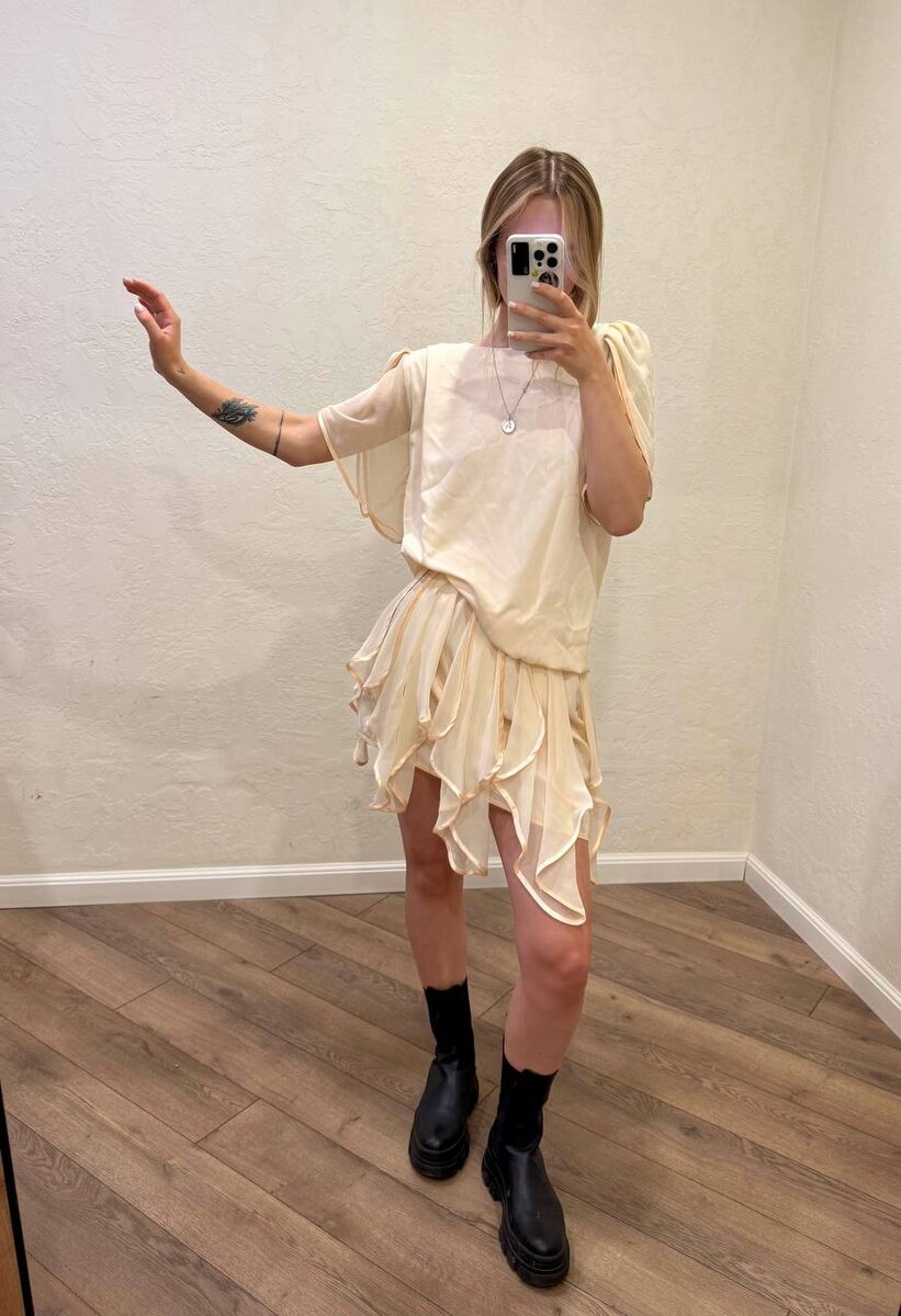 Винтажное платье в бежевом цвете с классной юбкой и красивыми рукавами Состояние: идеальное Размер: m/l Стоимость: 2200 руб Связь со мной @AngelinaJolinee #ЛюдиВещиНаличие