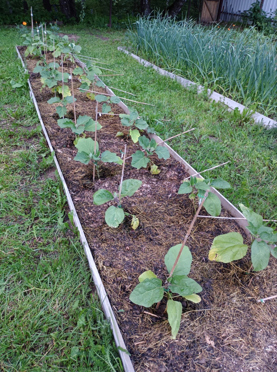 Ближе к закату дошли руки опоры для баклажан ставить. Один ряд осилил. Комары достали. Оставил другой ряд на завтра. Ещё фасоль нужно посадить сюда. Семена проклюнулись. Но сегодня Клубничная Луна, Полнолуние. Сажать, пикировать не рекомендуется.
