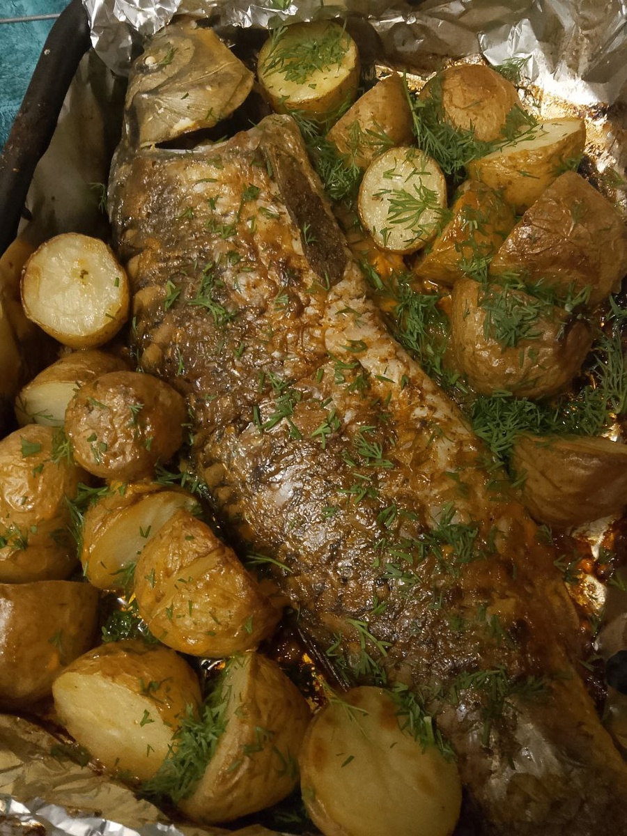Дикий речной сазан запеченый в дровенной печи с молодым картофелем....🫵Бон Аппетит 👍👍👍