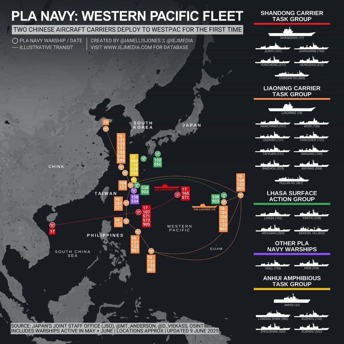 🇨🇳 Китай впервые вывел два авианосца в западную часть Тихого океана НОАК достигла нового рубежа: авианосцы «Ляонин» и «Шаньдун» вместе с флотом из более чем 20 кораблей одновременно проводят операции восточнее Тайваня. Это первое подобное развертывание двух действующих авианосцев в западной части Тихого океана.