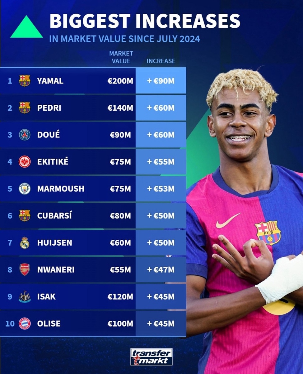 Transfermarkt закончил обновлять стоимость футболистов топовых лиг Европы в сезоне-2024/25, пора подводить итоги. Главный скачок предсказуемо сделал Ламин Ямаль. С июля 2024-го трансферная стоимость каталонского вундеркинда поднялась на 90 млн и теперь составляет 200 млн евро, что делает юношу самым дорогим игроком в мире. Второй результат разделили Педри и Дезире Дуэ: за год парни подорожали на 60 млн, испанец оценивается в 140 млн евро, а француз – в 90 млн евро. Третий результат выдал Юго Экитике, подорожавший на 55 млн евро с июля 2024 года. Игроки, показавшие самый высокий рост трансферной стоимости с июля 2024-го В топе самых дорогих игроков планеты после Ламина идут Джуд Беллингем, Эрлинг Холанд и Килиан Мбаппе – за каждого придется заплатить по 180 млн евро. Винисиус, которого до летнего обновления оценивали в 200 млн, подешевел на 30 млн и теперь занимает четвертое место в рейтинге. Следом идет Букайо Сака, чья трансферная стоимость составляет 150 млн евро. В топе нет представ