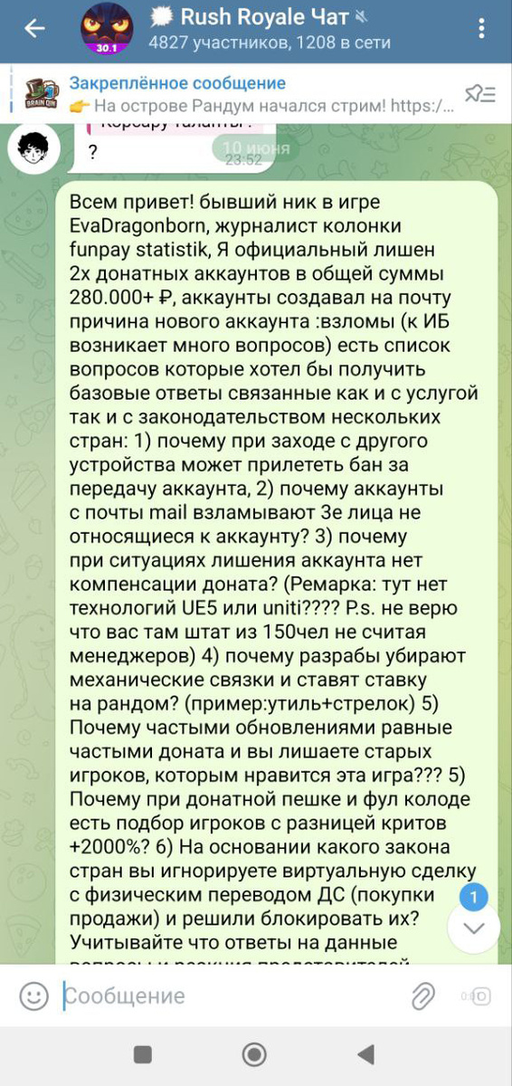 Представитель информации: бывший игрок EvaDragonborn (ник в игре), журналист SteamGameStatistik Я, как официальный игрок, лишился двух донатных аккаунтов на общую сумму более 280 000 ₽. Аккаунты были привязаны к почте Mail.ru, а причина блокировки указана как "взлом". Подозрительные обстоятельства: На основании анализа игровой практики и законодательства, я направил представителям игры официальный запрос. Ответа не последовало — только цензура. Вот проблемы, требующие реакции: Как вы видите после отправки сообщения в открытый чат не было предоставлено ответов, по уставу 56.3 обзорщик игровой индустрии обязан заявить о лишении доступа обратной связи в перечисленные игровые сообщества в перечисленные контактные организации для написания статей и может основываться на мнении многочисленных игроков. Данные из отчетов подтверждают системность проблемы: "95% игроков нарушают правила эпизодически, но только 5% — злостные нарушители. Однако системы наказания не дифференцируют их, наказывая