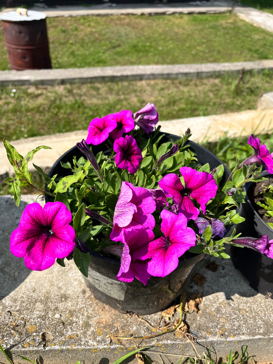 Петунии любят солнечный свет, регулярный полив и подкормку (1 раз в 2 недели минеральным удобрением). Прищипывайте верхушки, чтобы стимулировать пышный рост. К концу лета ваши новые растения зацветут, как видно на ваших первых фотографиях с пышными цветами.
