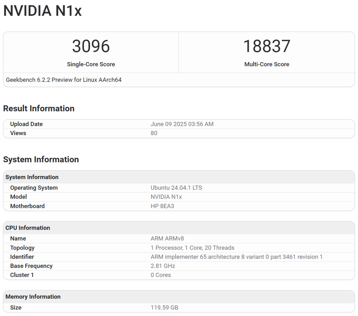 С 2023 года известно, что компания NVIDIA работает над собственным чипом для ноутбуков на базе архитектуры Arm, и теперь появились первые признаки существования этого чипа. Процессор с маркировкой «NVIDIA N1x» появился в онлайн-базе данных тестовой платформы Geekbench 6.2.2, где он набрал 3096 баллов в однопоточном тесте и 18837 баллов в многопоточном тесте. Этот чип был установлен в прототипе ноутбука под брендом HP с маркировкой «HP 8EA3», на котором Geekbench запускался в системе Ubuntu 24.04.1 LTS. Процессор идентифицирован платформой Geekbench с 20 логическими процессорами, это означает, что у него 20 ядер. Вполне возможно, что речь идет о многоуровневой конфигурации big.LITTLE, включающей эти 20 ядер. Кроме того, сообщается, что тактовая частота чипа составляет 2,81 ГГц. Компания также могла использовать в своем продукте референсные ядра ARM, такие как Cortex-X925 P и ядра Cortex A725 E. Также интересно видеть, что тестовый стенд HP, используемый для запуска Geekbench, включает с