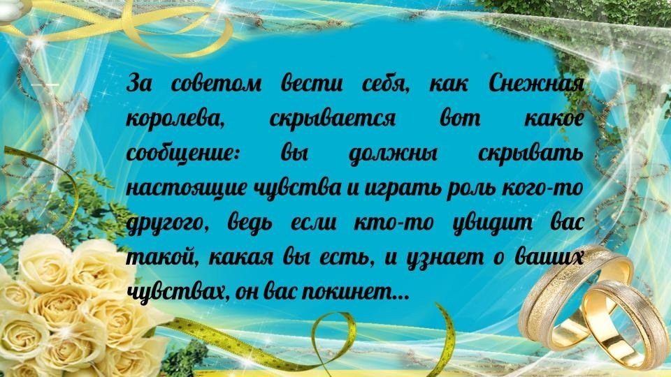 Понимаете, в чем дело, за советом вести себя, как Снежная королева, скрывается вот какое сообщение: вы должны скрывать настоящие чувства и играть роль кого-то другого, ведь если кто-то увидит вас такой, какая вы есть, и узнает о ваших чувствах, он вас покинет.