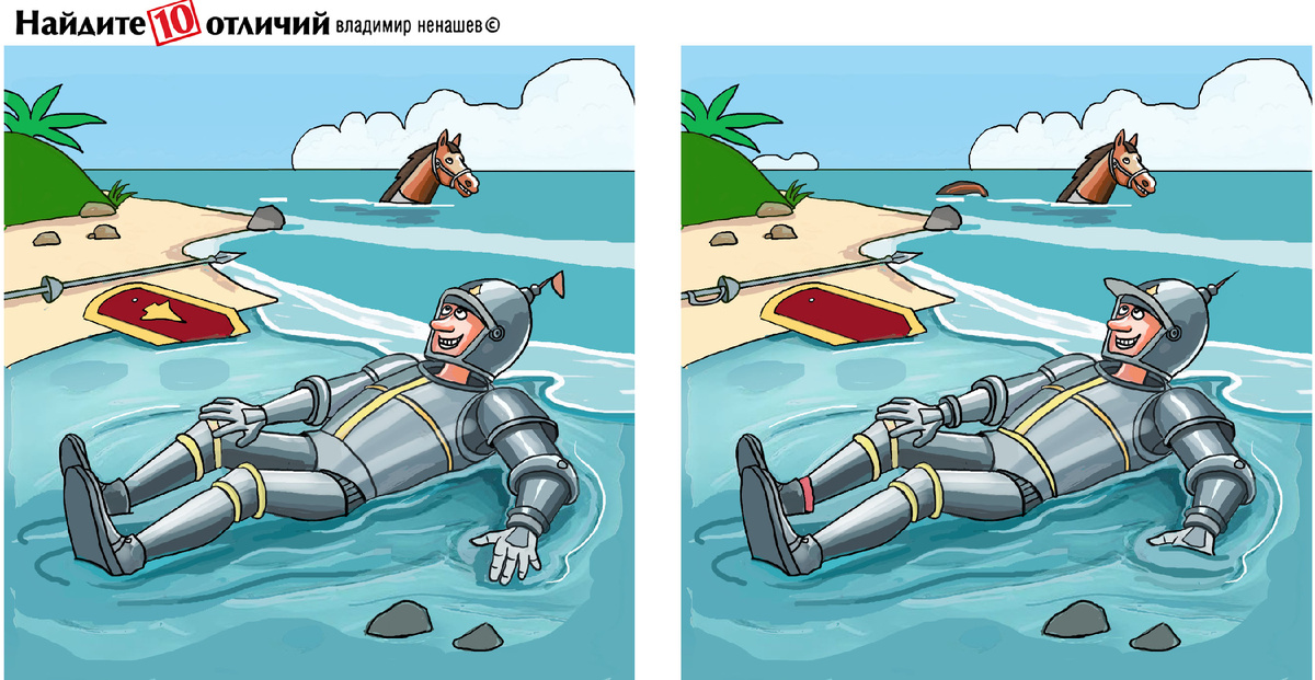 Всем привет! Сегодня тест простой и отыскать все отличия не очень сложно. Тема юмористическая. Рыцарь отдыхает в воде. Ведь его металлический костюм на солнце очень сильно нагревался. Ответ Дзен канал "Ура жизни"