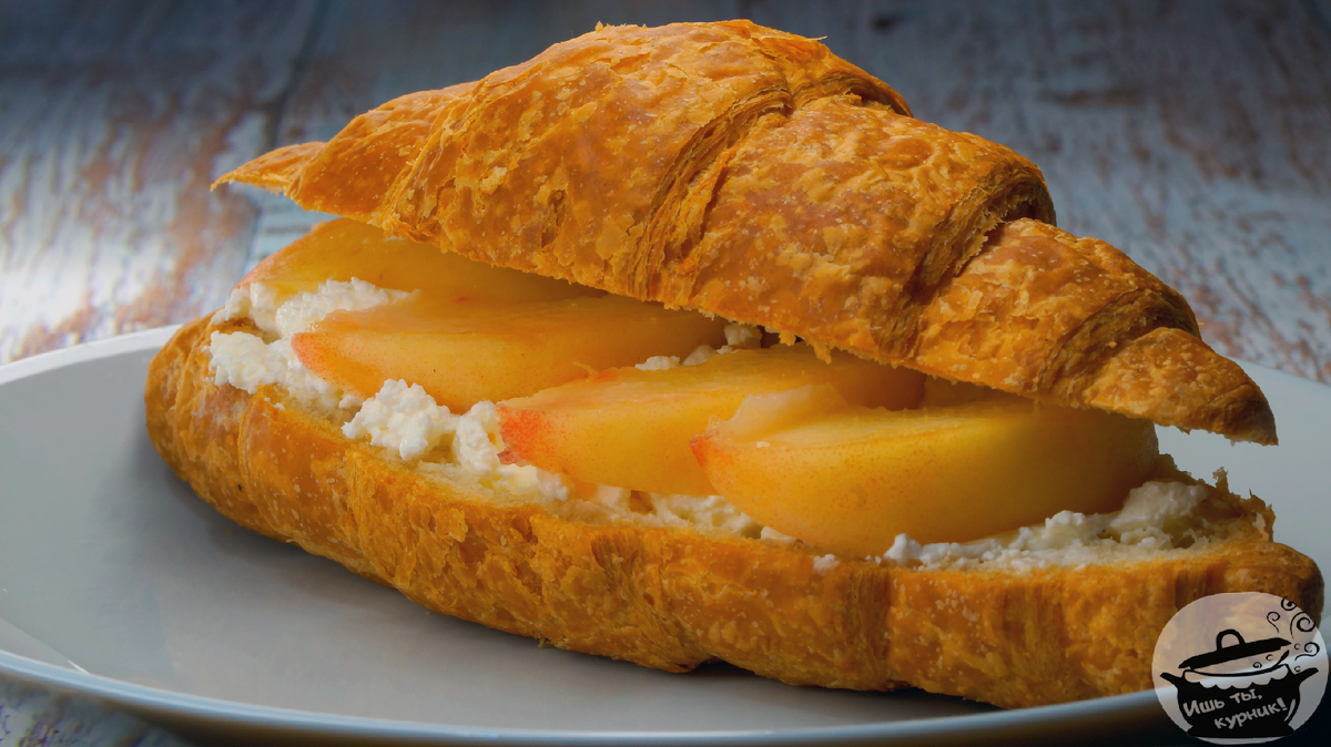Ингредиенты: · круассан – 4 шт.; · нектарины – 2 шт.; · творожный сыр – 100 гр.; · арахисовая паста – 4 ст.л. Приготовление: круассаны разрезать вдоль, из нектаринов удалить косточку и разрезать тонкими дольками. Нижнюю часть круассана намазать творожным сыром, верхнюю – арахисовой пастой, поверх сыра выложить дольки нектарина. Закрыть круассаны, слегка надавив. Приятного аппетита!