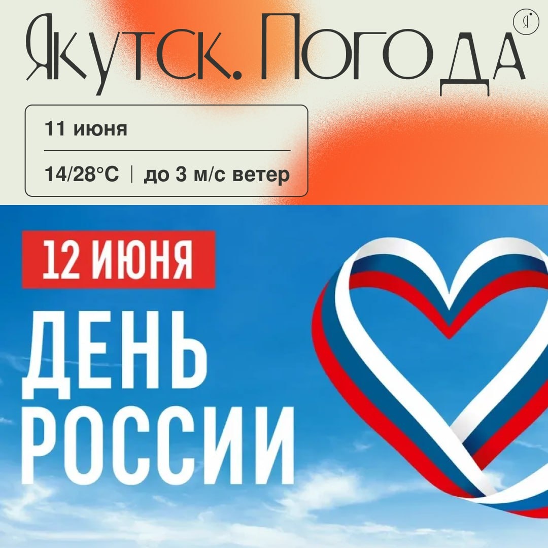 С добрым утром! 🇷🇺 Программа празднования Дня России Жителей и гостей республики ждут концерты, выставки, акции и другие культурные события. 11 июня 16:00 — Патриотический концерт «Вместе мы Россия!» Место: Якутский колледж культуры и искусств 12 июня 09:00 — Подъем флагов РФ и Республики Саха (Якутия) Место: Якутская ГРЭС-2 10:00–18:00 — Экскурсионная программа «Россия — Родина великих побед» Место: Музейный комплекс «Моя история» 11:00 — Эвенский национальный праздник «Эвинек» Место: Этнографический комплекс «Чочур Муран» 12:30 — Концертная программа «Россия сильна Единством» Место: Площадь Республики 18:30–20:30 — Концерт духового оркестра Lena River Brass Место: Центр культуры им. Ю.А. Гагарина 13 июня 14:00 — Праздничный концерт «С чего начинается Родина» Место: сквер Государственного цирка 19:00 — Гала-концерт мастеров искусств Республики Татарстан Место: Театр оперы и балета). Также в муниципальных районах и городских округах пройдут акции «Флаги России», «Россий
