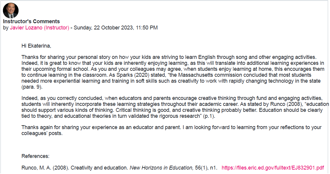 It is your responsibility to respond to three classmates by providing comments, asking questions, or having a conversation about their main post. Feedback should be appropriate, meaningful, and helpful. For instance refer to how your own experience supports/contradicts the opinions developed by your peers. If you think they are too general or not rooted enough in personal experience, you may also ask for more detailed examples supporting these opinions. In particular make sure that the examples provided are properly referenced and that you are able to access them. Overall, your comments should contribute positively to the conversation by broadening or clarifying it. Feedback should be at least 3-4 complete sentences.