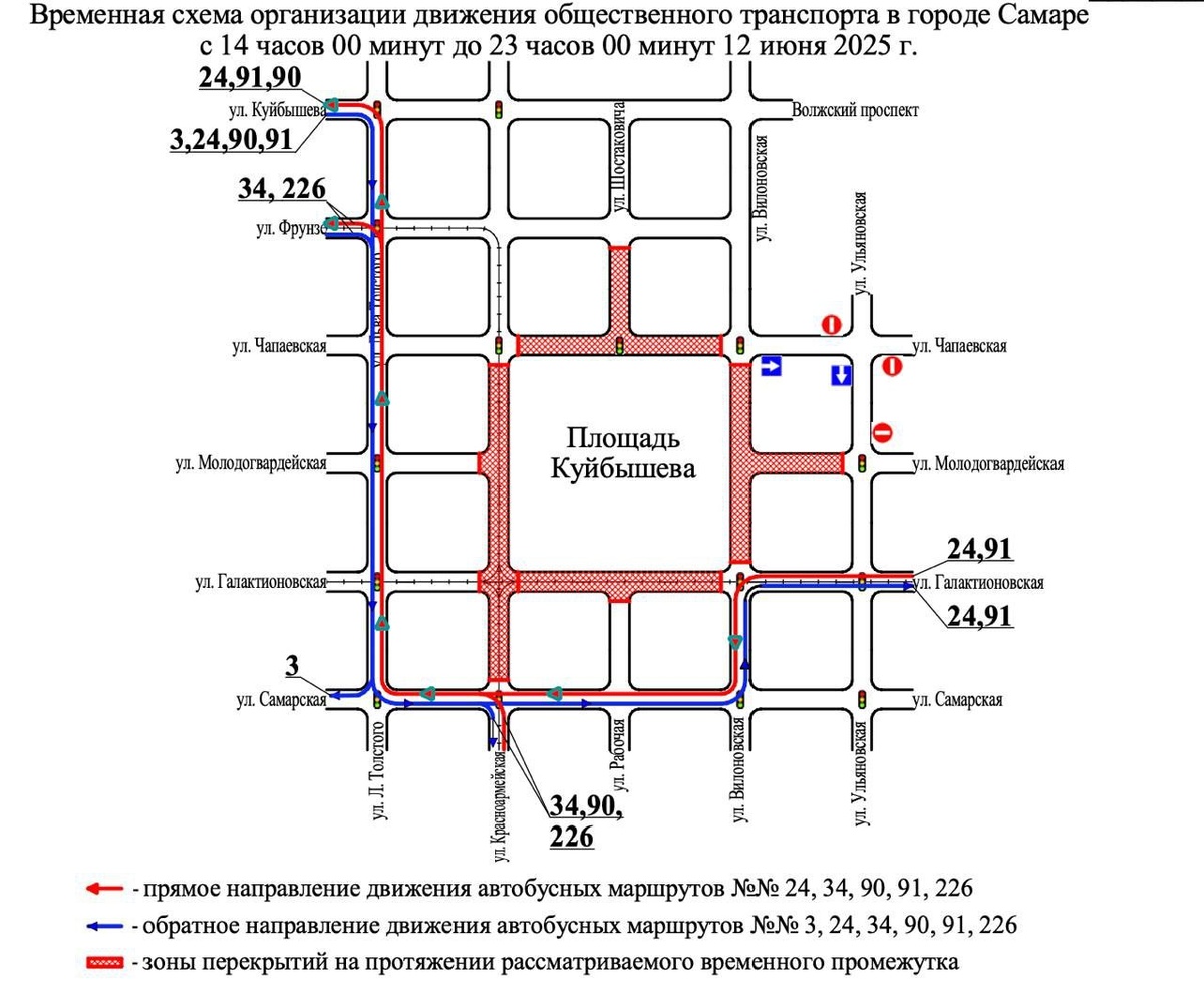 Ограничение движения в центре Самары 12 июня 12 июня в День России главной площадкой в Самаре станет площадь им. Куйбышева. Для безопасности с 14:00 до 23:00 будет ограничено движение на участках пяти улиц вокруг площади: - ул. Красноармейская (от Чапаевской до Самарской) - ул. Чапаевская (от Красноармейской до Вилоновской) - ул. Шостаковича (от Фрунзе до Чапаевской) - ул. Вилоновская (от Чапаевской до Галактионовской) - ул. Молодогвардейская (от Ульяновской до Вилоновской) 🚫 С 20:00 11 июня до 23:00 12 июня на этих участках запрещены остановка и стоянка. Исключения: машины полиции, скорой, пожарных и транспорт с пропусками ГИБДД. 🚌 Изменения в транспорте: - Автобусы № 24, 34, 90, 91, 226 — по изменённым маршрутам (с 14:00 до 23:00). - Трамваи — по обычному расписанию. ⚠️ Внимание! Светофоры переведут в режим мигающего жёлтого, перекрёстки станут нерегулируемыми. Будьте осторожны! 📸: Департамент транспорта Самары
