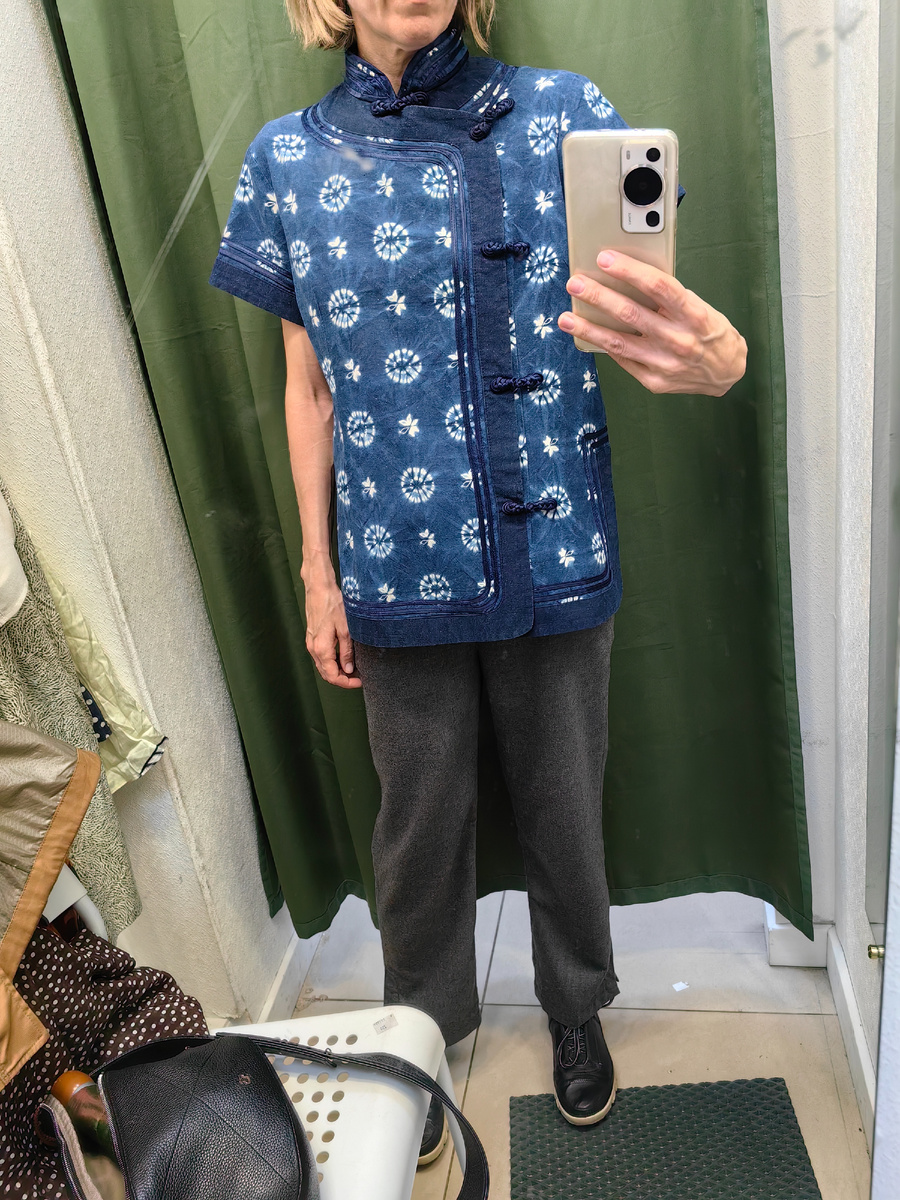 Добрый день, меня зовут Тоня и сегодня я приглашаю вас посмотреть на мои находки. Напомню, что я создала канал в телеграм - для тех, кто хочет купить что-то из того, что я нахожу. Если вы заинтересованы, подписывайтесь и уже там я напишу заранее, когда планирую пойти в магазин. Итак, поехали! Первая и самая классная штука, которую я увидела - рубашка в традиционном китайском стиле. Это китайская же рубашка, сделана в Китае в смысле. Я обожаю такие аутентичные вещи. Эта сделана великолепно, я в восторге, долго в ней крутилась, очень хотела ее купить. С темно-синими брюками палаццо она бы смотрелась очень круто. Просто полюбуйтесь! Цвет, принт, застежки - все идеально и даже лучше! Я просто была очарована ею. Плотный, очень качественный хлопок, принт в технике тай дай, не представляю, насколько это кропотливая работа - такой мелкий узор сделать. К огромному сожалению для меня, она явно была любима и ее носили долго и со вкусом. На рубашке видны следы эксплуатации, не много, но они