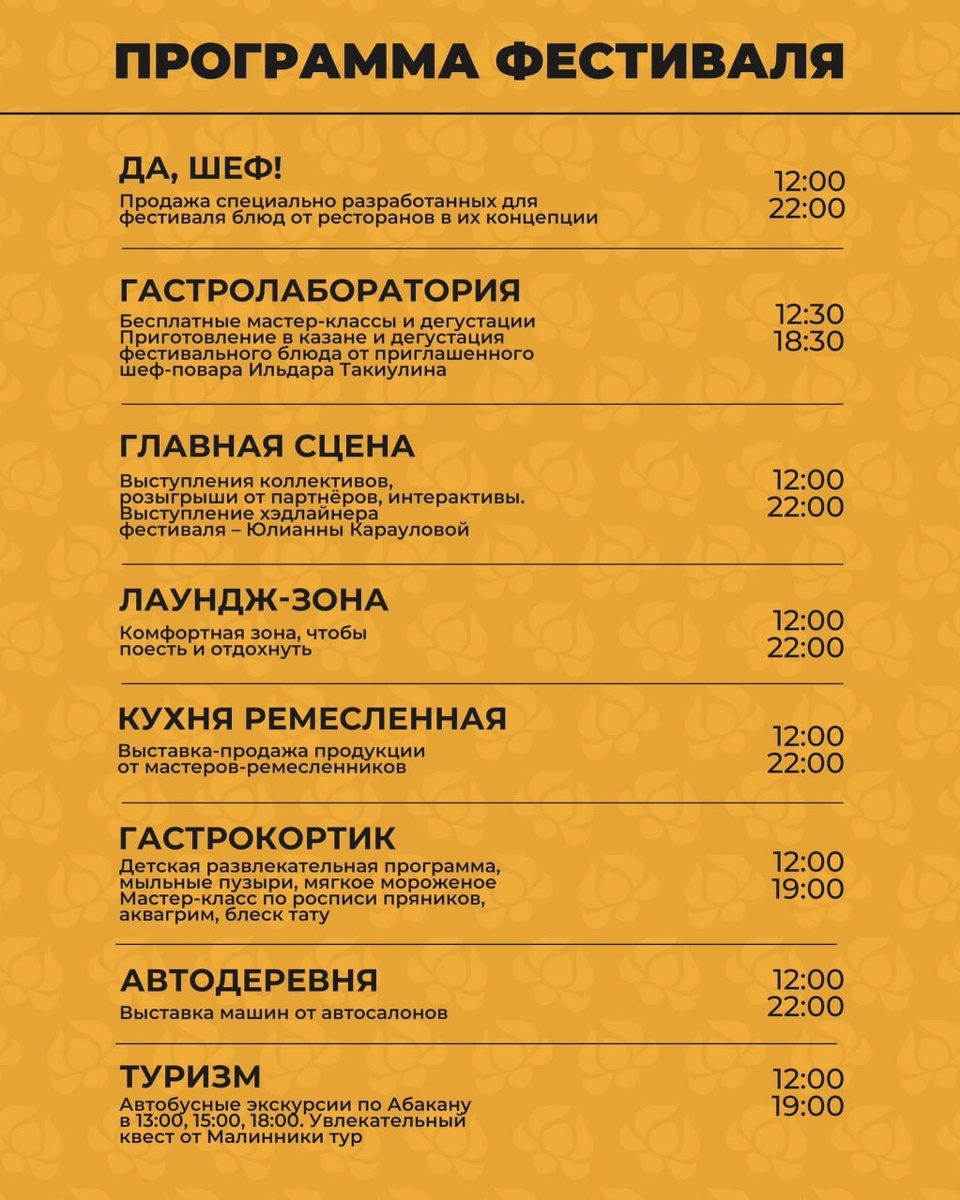 Завтра состоится гастрофестиваль «Жарче» Что нас с вами ждет? ▪️ еда от лучших ресторанов Абакана ▪️ мастер-классы и дегустации ▪️ выставки и детские развлечения ▪️концерт с хедлайнером Юлианной Карауловой Сохраняйте программу, встретимся в ПКиО Абакана. 🖼 Хакасия. Главное здесь