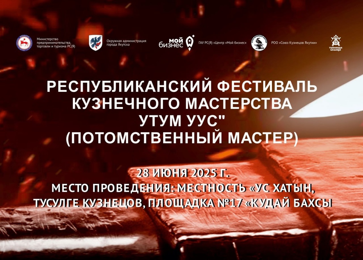 🚀Приглашаем кузнецов к участию в республиканском фестивале кузнечного мастерства «Утум Уус» («Потомственный мастер»), который состоится 28 июня в местности Ус Хатын (тусулге кузнецов, площадка №17 «Кудай Бахсы»). Фестиваль посвящен 80-летию со дня рождения легендарного якутского кузнеца Бориса Федоровича Неустроева - Мандар Уус. Организаторы мероприятия - Союз кузнецов РС(Я), Центр «Мой бизнес» и Управление культуры и духовного развития города Якутск. ⚡️Вас ждут: ✔️Мастер-классы от лучших кузнецов Якутии ✔️Яркая музыкальная и культурная программа ✔️Уникальная выставка кузнечных изделий ✔️Захватывающие конкурсы для кузнецов 🌟Номинации конкурсной программы: ✔️«Бастын саха быhа5а» («Лучший якутский нож») ✔️«Бастын бадаайы» («Лучший большой нож») ✔️«Туругур Туймаада хому5а» («Здравствуй, хомус Туймаады») ✔️«Утум Уустар» («Молодые последователи традиции кузнеца») ✔️«Бастын уус-уран оноhуулаах саха быhа5а» («Лучший художественный якутский нож») ✔️«Бастын уус-уран оноhуулаах тимир оноhук