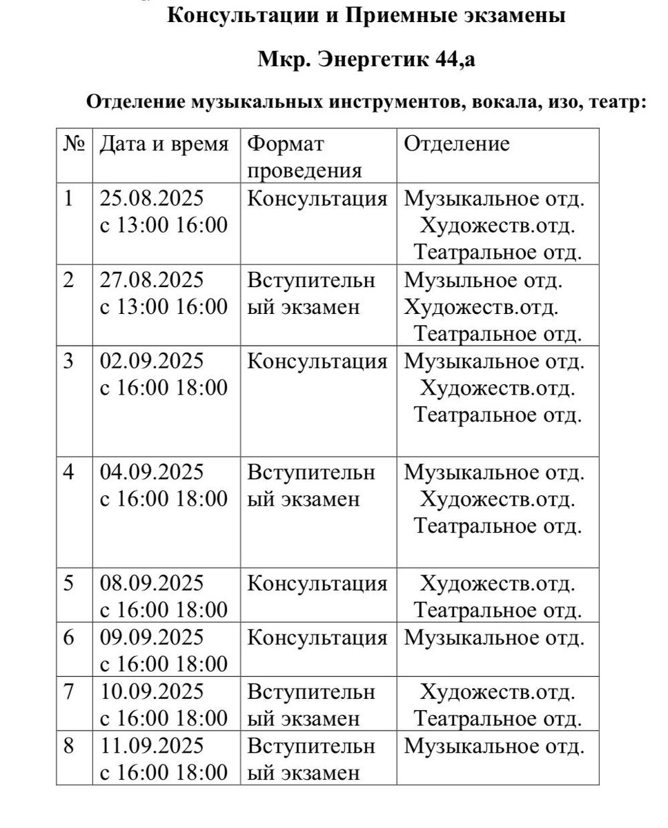 🤩🌟График консультаций и вступительных экзаменов на 2025-2026 учебный год. ✅Мкр. Энергетик 44,а 25.08 с 13:00 16:00 Консультация все отделения 27.08 с 13:00 16:00 Вступительный экзамен все отделения 02.09 с 16:00 18:00 Консультация все отделения 04.09 с 16:00 18:00 Вступительный экзамен все отделения 08.09 с 16:00 18:00 Консультация Художеств.отд. Театральное отд. 09.09 с 16:00 18:00 Консультация Музыкальное отд. 10.09 с 16:00 18:00 Вступительный экзамен Художеств.отд. Театральное отд. 11.09 с 16:00 18:00 Вступительный экзамен Музыкальное отделение. ✅мкр. Стеклозавод СОШ №43, каб.:303,305: 25.08 с 14:00 16:00 Консультация 27.08 с 14:00 16:00 Вступительный экзамен 01.09 с 12:00 16:00 Консультация 03.09 с 16:00 18:00 Вступительный экзамен 08.09 с 16:00 18:00 Консультация 09.09 с 16:00 18:00 Вступительный экзамен 10.09 с 16:00 18:00 Консультация 11.09. с 16:00 18:00 Вступительный экзамен #дши13_уу #учебныйгод🤩