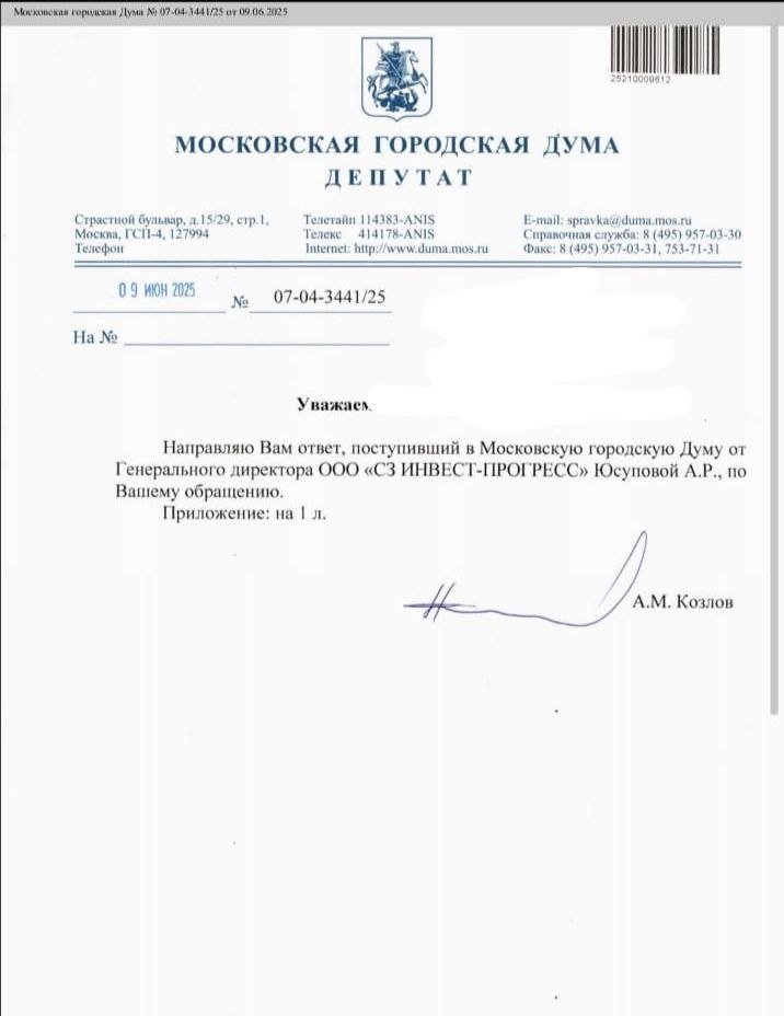 Получить ответ получилось благодаря обращению к депутату Мосгордумы от нашего округа. На обращения жителей или групп жителей застройщик ранее никакого ответа не давал.