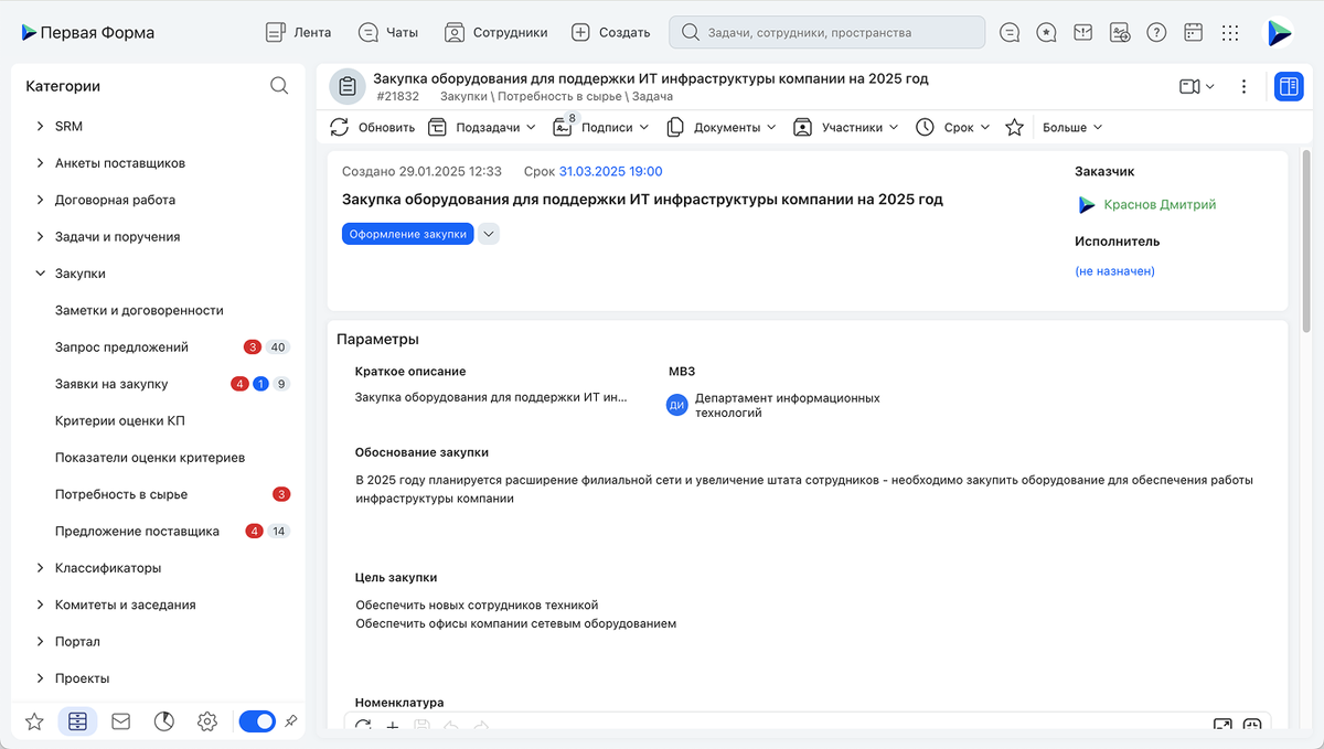 Сотрудник/менеджер по закупкам формирует задачу, указывает потребности и обоснование, а далее направляет их на согласование руководству/директору по закупкам.