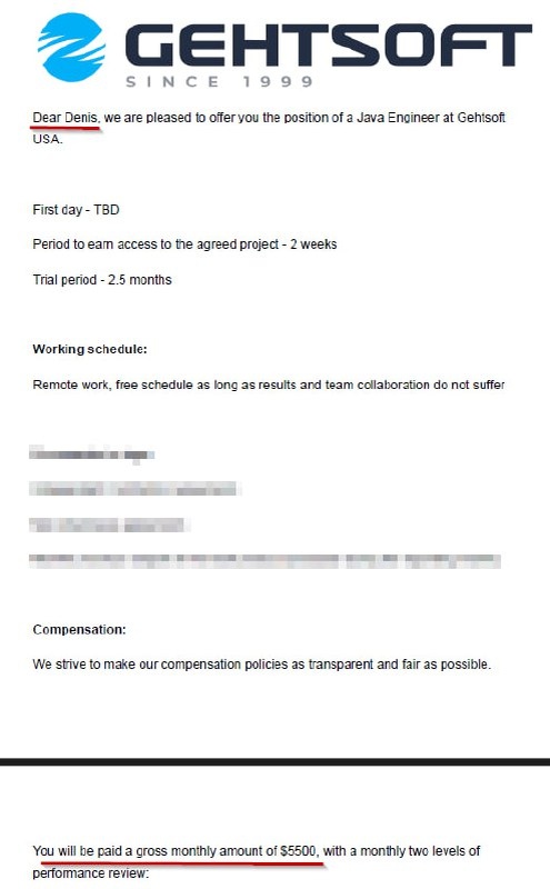 Пост 5. Про вакансию Oracle/Java Developer. Итоги Друзья, всем привет! Сегодня у нас заключительный пост про компанию GehtSoft. Не буду вас томить, коллеги, просто скажу - оффер я получил ✅ Кратенько, что там было 🔸 Зарплата: $5500 в месяц (gross) 🔸 Должность: Java Engineer 🔸 Формат: удалёнка, гибкий график 🔸 Испытательный срок — 2,5 месяца 🔸 Ежемесячная оценка: — Командная — достигает ли команда цели — Индивидуальная — достигаешь ли ты личных целей — Если цели не достигнуты — оплата может снизиться, но не ниже 50% 🔸 Годовой бонус: от 1 до 3 окладов, если проработал > 6 месяцев 🔸 После испытательного срока — $1000/год на технику Как мне видится эта позиция ➕ ▫️Валютная удалёнка с зарплатой $5500. С учётом налогов Грузии — 1% для ИП — вообще норм. ▫️Потенциальные бонусы, $1K на технику и т.п. Работать можно откуда угодно, кроме РБ и РФ. ▫️Довольно серьёзный профессиональный вызов — распил Ораклового монолита. ▫️Продолжительность проекта озвучена как ~1,5 года, но, на мой взгля