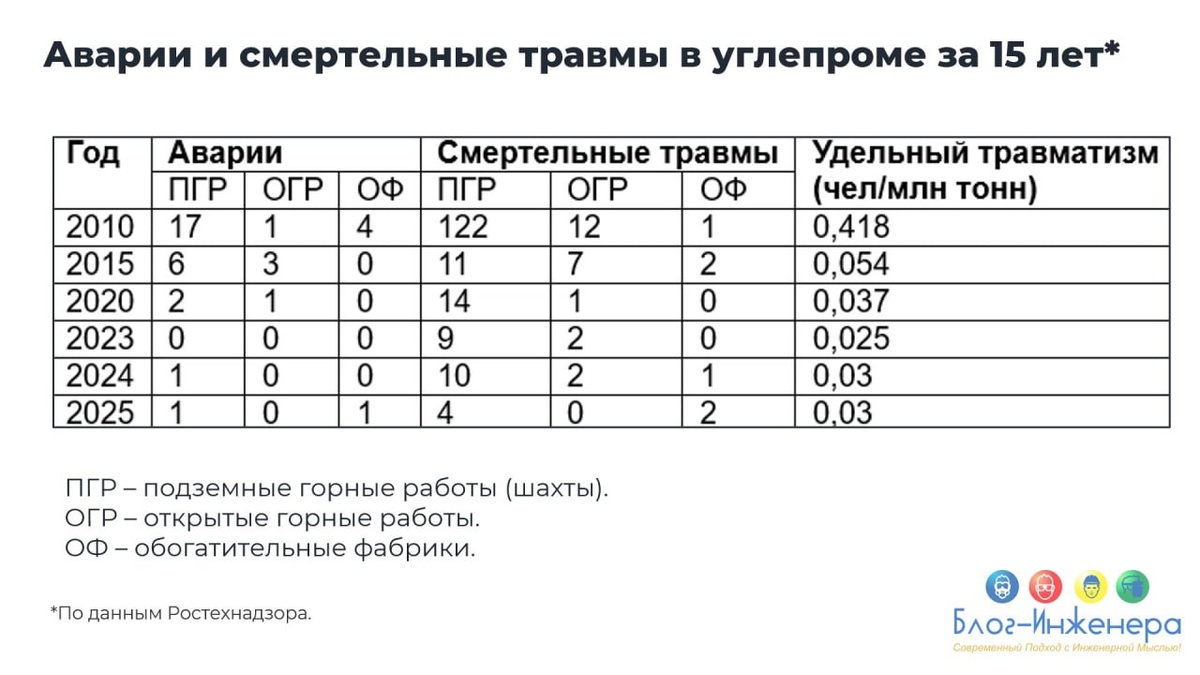 Жизнь за уголь: сколько человек погибло в углепроме с начала года На прошлой неделе в Новокузнецке проходило главное деловое событие года — выставка «Уголь России и майнинг» (мы писали о том, что там было здесь и здесь). Традиционно здесь не только представляют новинки техники для углепрома, но и обсуждают состояние отрасли. Представители Минэнерго и Ростехнадзора рассказали, почему шахтёры продолжают гибнуть в 2025 г. и не связано ли это с экономией на безопасности. По данным за 2024 год, в угольной отрасли России насчитывается 57 шахт. Из них две кузбасские шахты не вели добычу: «Полысаевская» законсервирована, «Инская» приостановила работы. Такие данные привёл заместитель директора департамента угольной промышленности Минэнерго России Михаил Верзилов. По его словам, ежегодно сами предприятия и эксперты оценивают риски. Согласно этой оценке в прошлом году, максимальное число факторов опасности имеют четыре угольных предприятия на юге Кузбасса — шахты «Усковская», «Юбилейная», «Боль