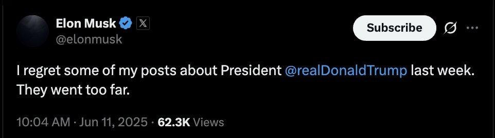 “Prezident Tramp haqidagi o‘tgan hafta yozgan ba'zi postlarimdan afsusdaman. Biroz oshirib yubordim", degan tadbirkor.