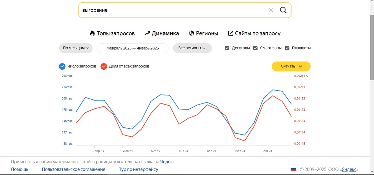 *Среднее арифметическое значение, полученное из данных «Яндекса» за период с февраля 2023 по январь 2025.