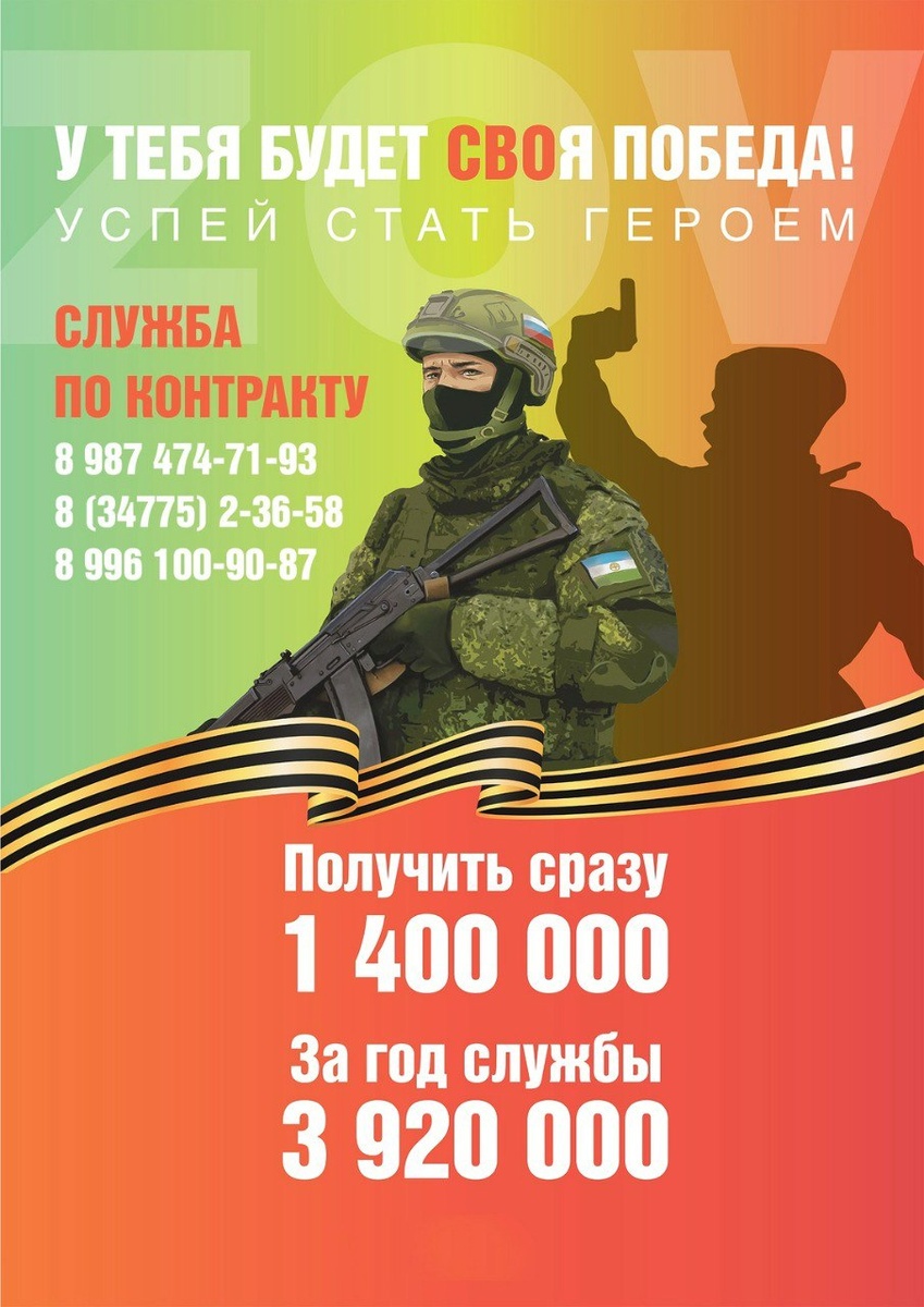С 5 июня текущего года единовременная выплата жителям республики, заключившим контракт с Министерством обороны РФ, составляет 1,4 млн рублей. Для поступления на службу по контракту необходимо обратиться в военкомат по адресу: г. Сибай, ул. Пионерская, 7, тел. 8-987-474-71-93; 8 (34775) 2-36-58; 8-996-100-90-87. #Сибай #СВО
