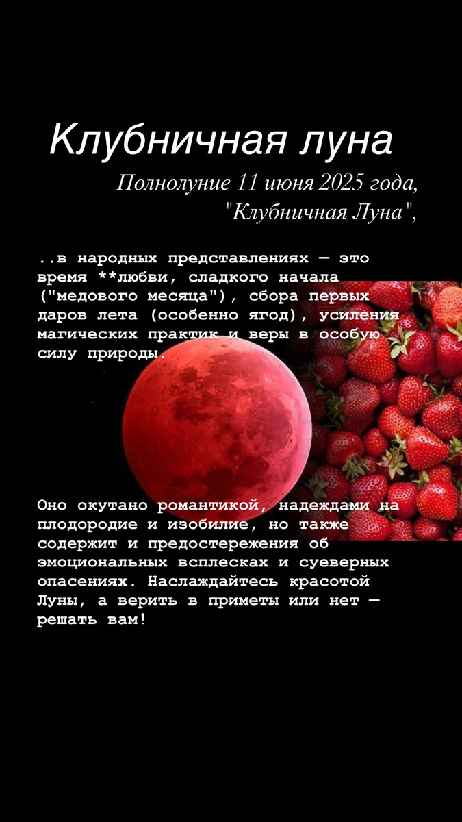 🌘Полнолуние 11 июня 2025 года, "Клубничная Луна", в народных представлениях — это время **любви, сладкого начала ("медового месяца"), сбора первых даров лета (особенно ягод), усиления магических практик и веры в особую силу природы.** Оно окутано романтикой, надеждами на плодородие и изобилие, но также содержит и предостережения об эмоциональных всплесках и суеверных опасениях. Наслаждайтесь красотой Луны, а верить в приметы или нет — решать вам!