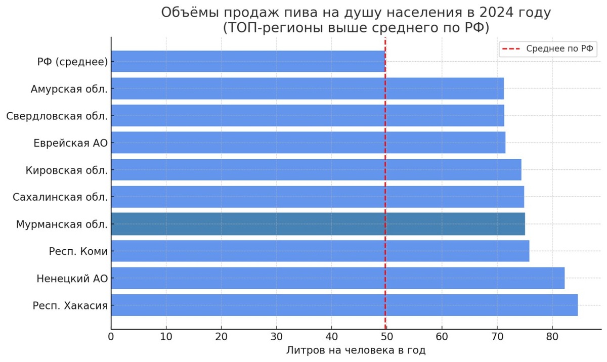 В ответ на пост Согласно докладу Роспотребнадзора «О состоянии санитарно-эпидемиологического благополучия населения в Российской Федерации в 2024 году», Мурманская область, а также республика Коми и Ненецкий автономный округ вошли в ТОП-10 российских регионов по объемам розничных продаж населению пива. При этом, среднероссийский показатель в 2024 году составлял 49,72 литров на человека. ❄ «Арктический Обозреватель»