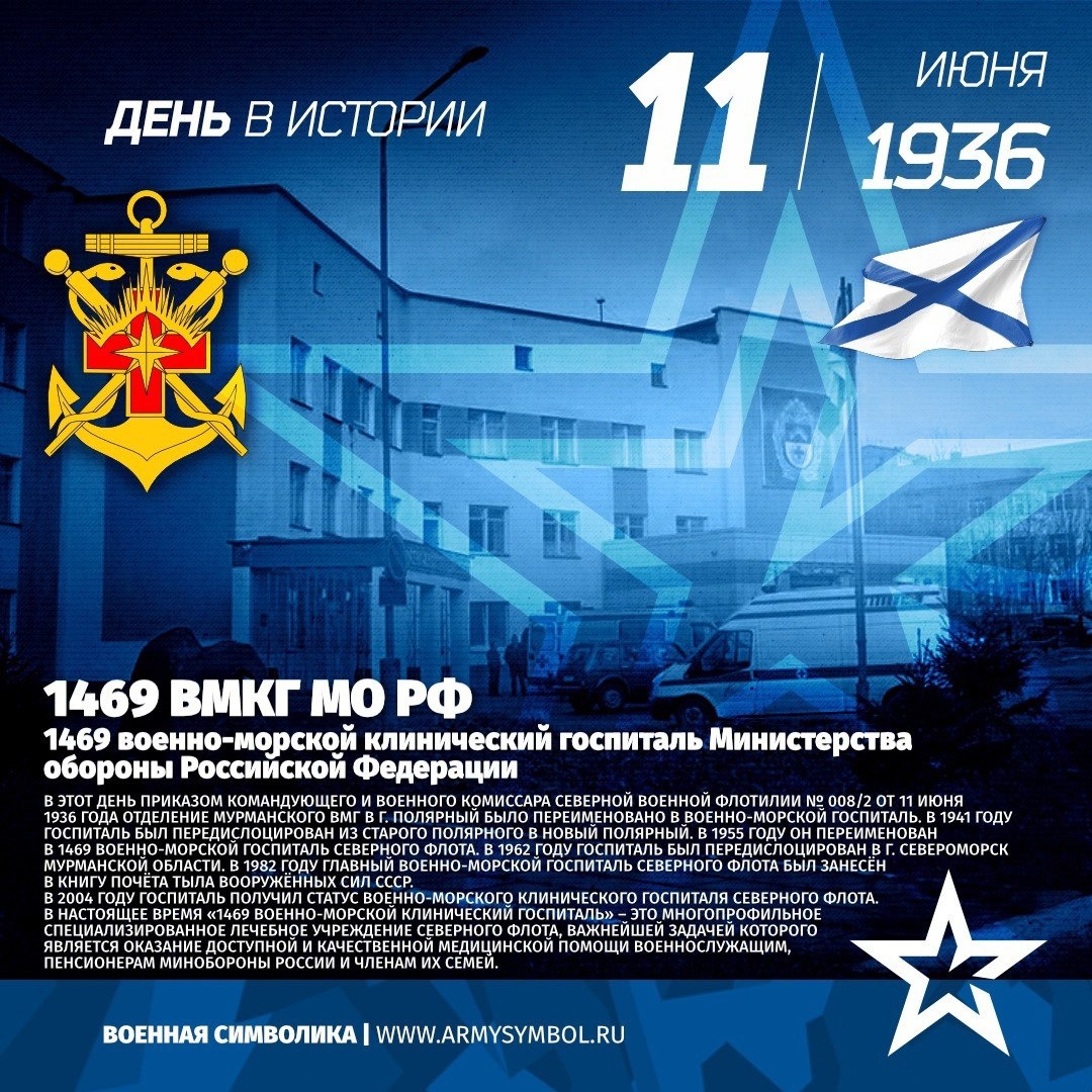 1469 ВМКГ МО РФ с 1936 1469 военно-морской клинический госпиталь Министерства обороны Российской Федерации В этот день отделение Мурманского госпиталя в г. Полярном было переименовано в Военно-морской госпиталь Северного флота. День рождения Военно-морского клинического госпиталя Северного флота (Основание: приказ командующего Северной военной флотилией и военного комиссара Северной флотилии № 008/2 от 11 июня 1936 г., отделение Мурманского госпиталя в главной базе Северного флота г. Полярный было переименовано в ВМГ). Как отдельная воинская часть в системе медико-санитарной службы СФ госпиталь стал существовать лишь с января 1936 г. с 100-коечным штатом. Размещался в приспособленном двухэтажном доме. Состоял из хирургического, терапевтического, неврологического, кожно-венерологического отделений, бокса для инфекционных больных, палат для ЛОР-больных. В штате имелось: 2 санитарных к Показать полностью... Подпишитесь на наши группы ВКонтакте и в Одноклассниках - читайте, смотрите и к