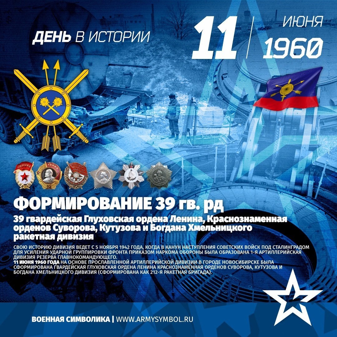 11 июня 1960 года на основе прославленной артиллерийской дивизии в городе Новосибирске была сформирована гвардейская Глуховская ордена Ленина Краснознамённая орденов Суворова, Кутузова и Богдана Хмельницкого дивизия (сформирована как 212-я ракетная бригада. в апреле 1961 преобразована в ракетную дивизию).