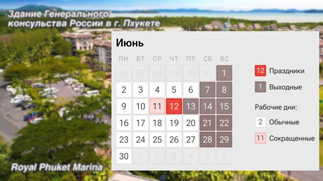 Генеральное консульство России на острове Пхукет объявило о сокращенном рабочем времени 11 июня и последующих четырехдневных выходных, связанных с празднованием Дня России 12 июня.