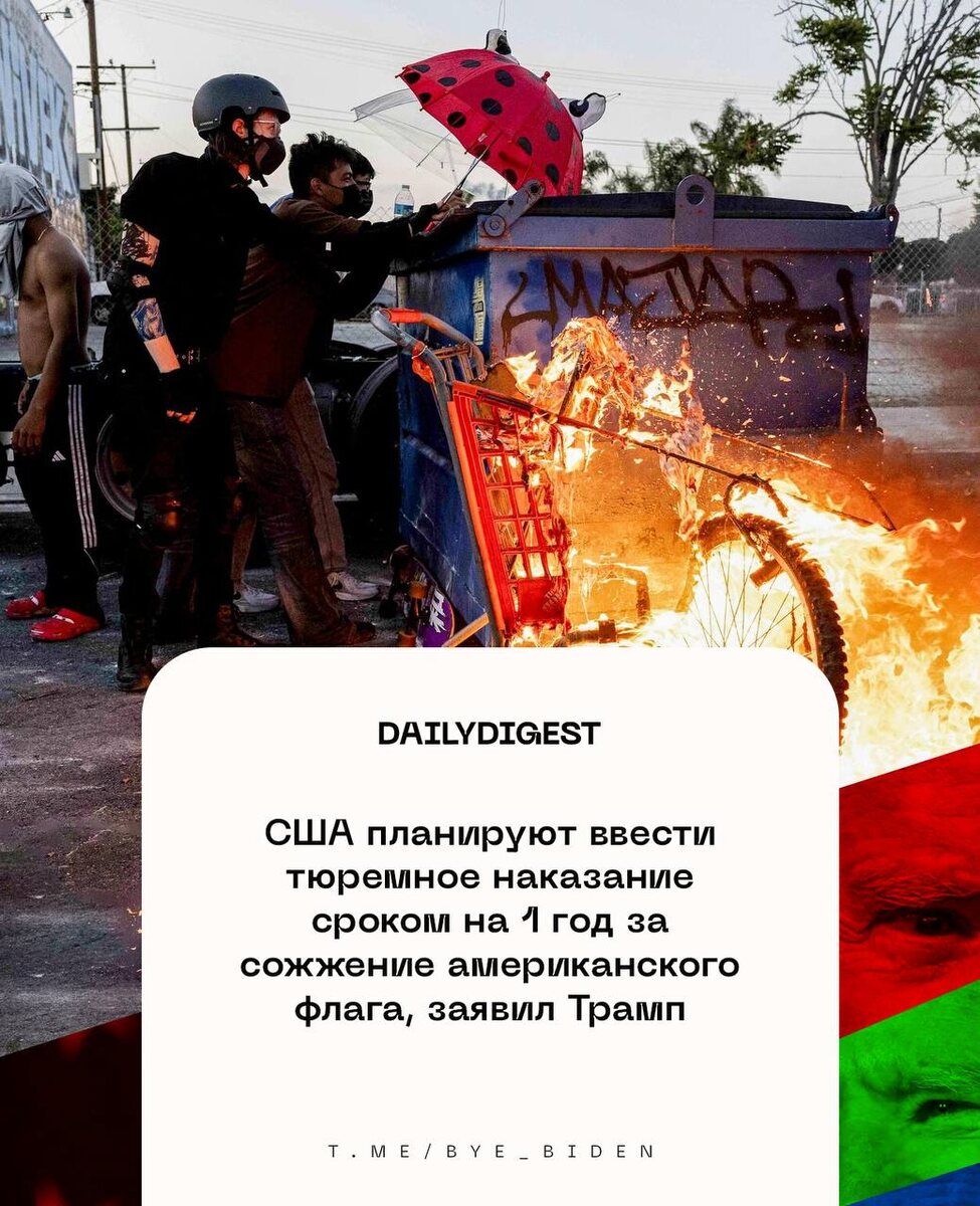 🔹США планируют ввести тюремное наказание сроком на 1 год за сожжение американского флага, заявил Трамп.