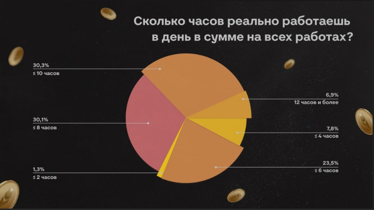 Среди 1 тысячи опрошенных 93% опрошенных работают меньше 12 часов в сутки на двух и более работах. Один процент умудряется работать не более 2 часов в день. Большинство опрошенных разработчики ~63%.