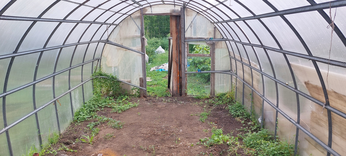 А на первом фото к этой статье как раз наша свободная от дачной растительности теплица. Оставалось очистить ее от травы, посыпать грунт горчицей с борной кислотой от муравьев и застелить чистым толстым рекламным баннером... Новый хороший поликарбонат... Торцы, правды из подручного материала, но это же такая ерунда....Теплица была уже свободна вообще! Заноси бассейн и купайся!