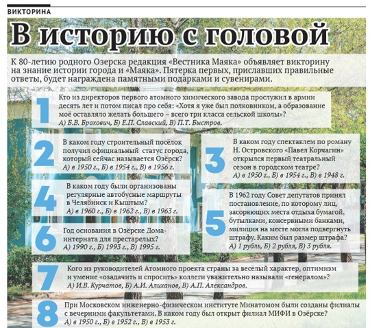 Но. Идея провести Викторину в честь 80-летия Росатома -это хорошая затея. Вестник Маяка уделяет большое внимание истории Росатома, истории комбината и Озерска.
